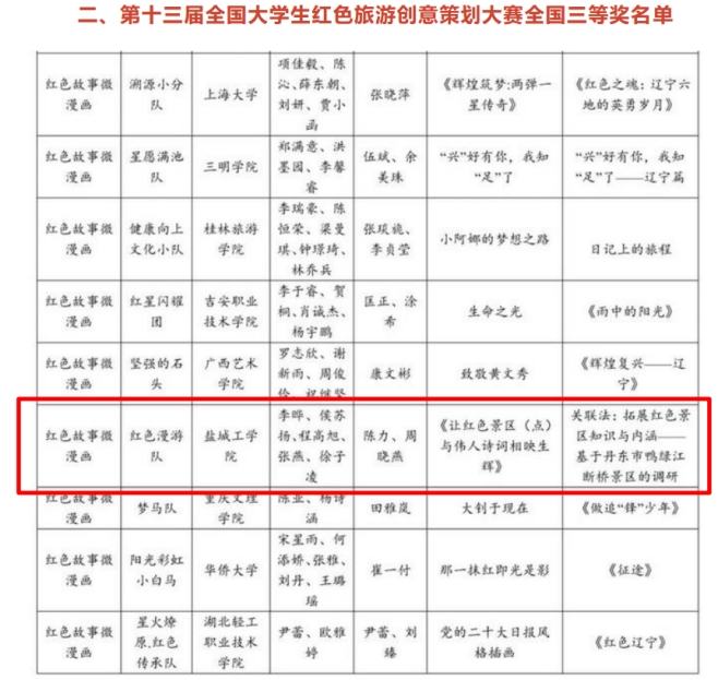 全国大学生红色旅游创意策划大赛已连续举办十三届,是目前国内规模最大的大学生旅游专业赛事,入选教育部全国大学生思想政治工作精品项目,被称为“面向千校万人的思政教育平台”“行走在祖国大地上的思政大课”。