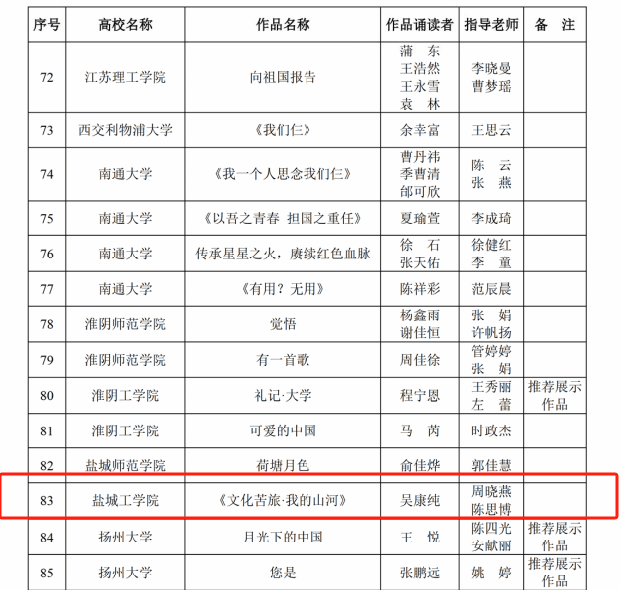 11月3日,江苏省首届大学生读书节闭幕式在东南大学九龙湖校区举行。人文社会科学学院由周晓燕、蒋继华、陈思博老师指导作品《坚定理想信念,千锤百炼终成钢》、 《浅析孤独的三种形态》、 《苦难究竟给福贵带来了什么?》荣获书评比赛二等奖,《文化苦旅.我的山河》荣获“云诵读”活动优秀作品奖。