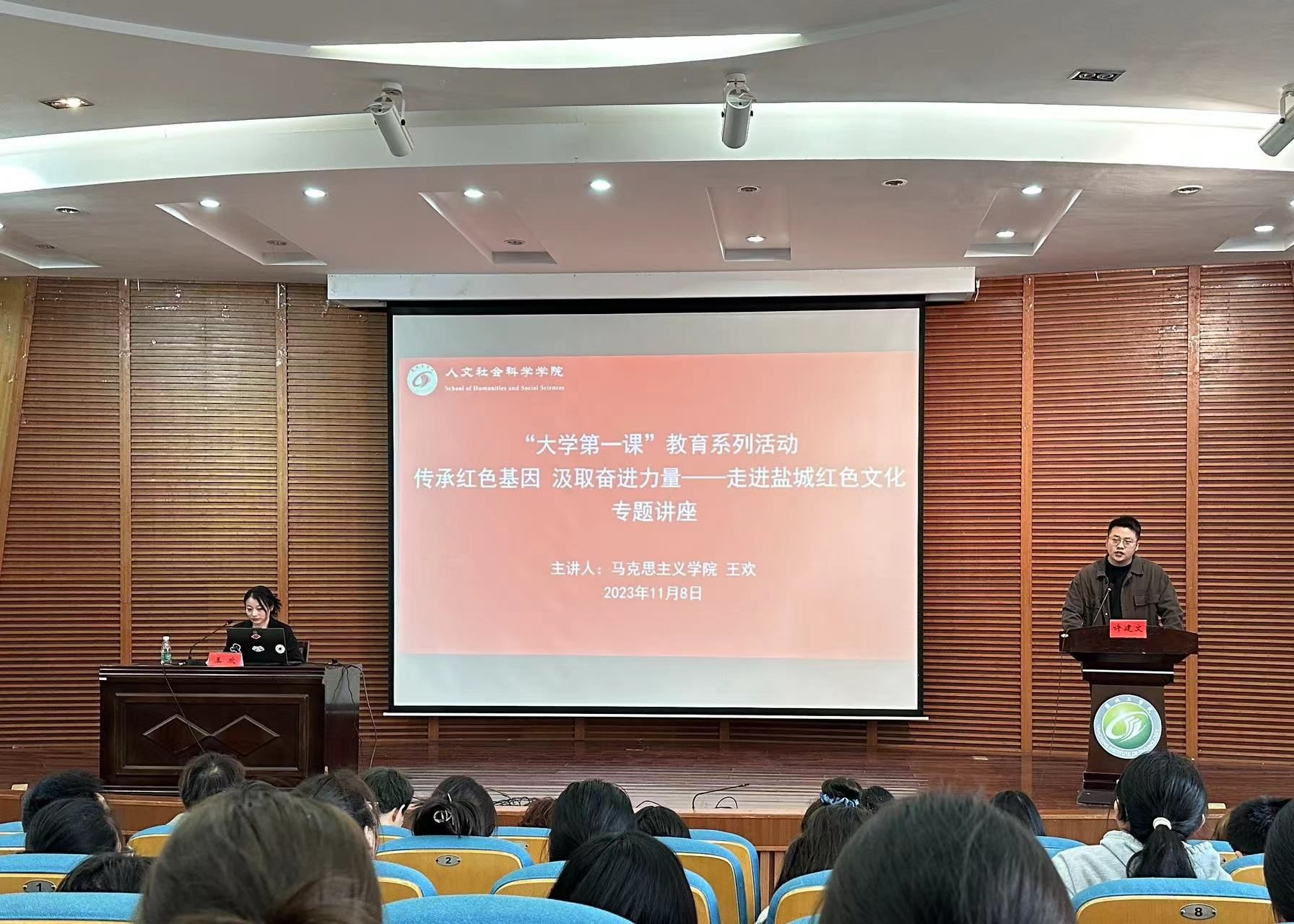 11月8日,人文学院在润美楼报告厅举办2023级新生“大学第一课”教育系列讲座,马克思主义学院教师王欢应邀主讲。活动由学院辅导员许建文主持,2023级全体新生参加。