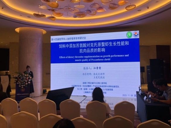会上,夏斯蕾博士作题为《发酵大豆替代鱼粉对克氏原螯虾肠道微生物、消化酶及肠道组织结构的影响》的学术报告,介绍了在当今配合饲料需求增大,鱼粉短缺背景下,团队通过前期在发酵大豆菌种选择、工艺优化、发酵前后营养组成对比及微生物分布变化的研究基础上,综合分析发现在克氏原螯虾饲料中使用25%发酵大豆替代鱼粉具有显著改善克氏原螯虾肠道健康的效果,这为生产上节约鱼粉等原料提供很好的思路。江青青同学在研究生论坛以《饲料中添加苏氨酸对克氏原螯虾生长性能和肌肉品质的影响》为题,分享了通过评价克氏原螯虾生长和肌肉品质得出克氏原螯虾饲料中最适的苏氨酸添加水平。