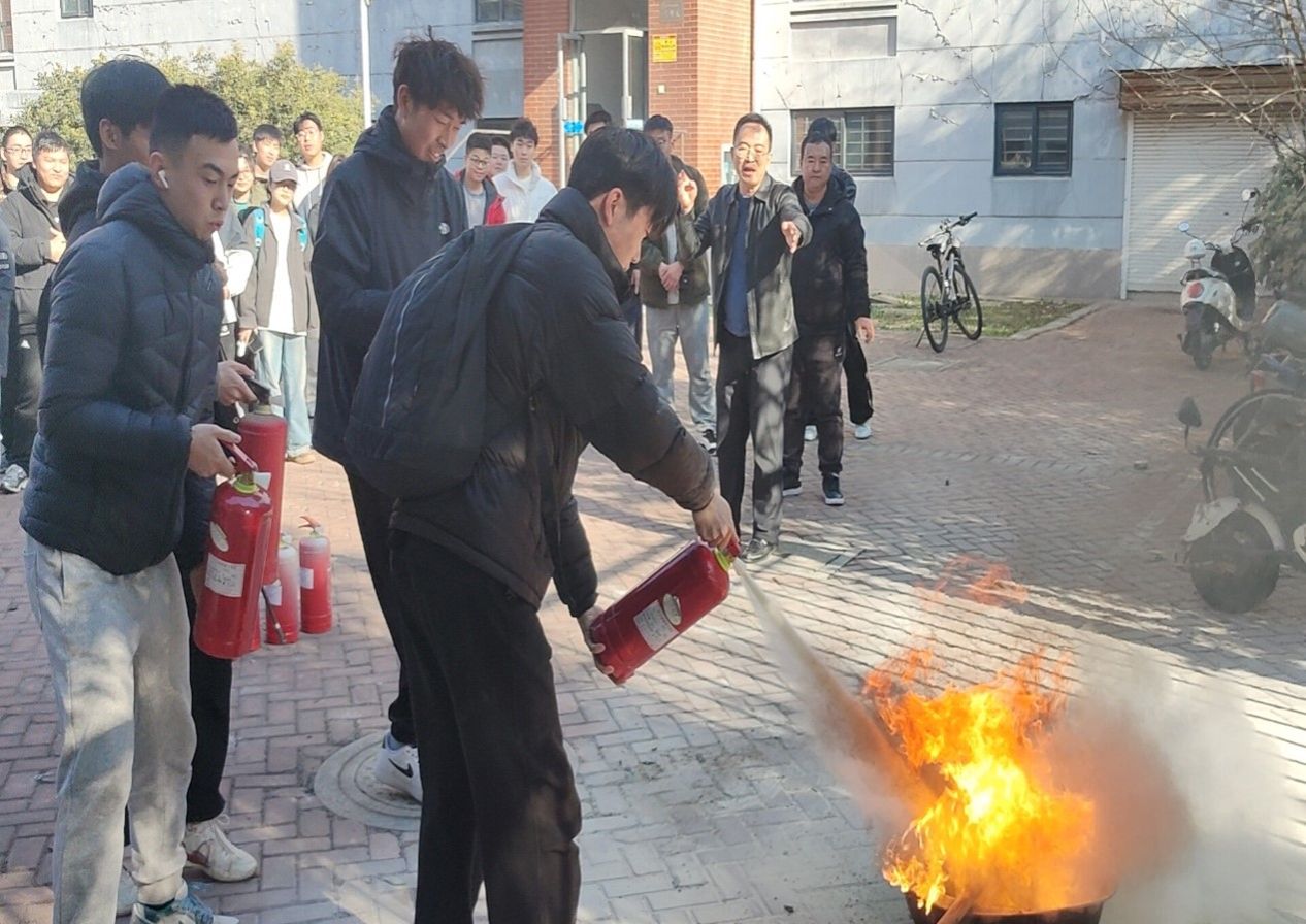公开课结束后,全体人员在学生宿舍27号楼进行了消防实地演练。学院邀请校保卫处相关负责人员现场讲解了灭火器的构造、使用方法及注意事项等,并指导师生进行实践操作。