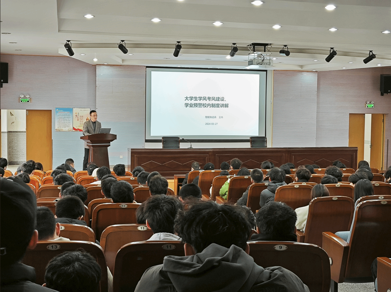 3月27日下午,机械优集学院分别在北校区体知楼105和南校区土木馆报告厅召开智能制造专业系教育大会。智能制造系主任卢倩、副主任王伟,硕士生导师代表曾勇、张本国,学科竞赛办主任侯鹏亮,研究生秘书梁华,青年教师代表周耀武、董善文出席。机械优集学院学工办副主任程云庆主持,机械电子工程专业、智能制造工程专业2022级和2023级本科生近500人参加。