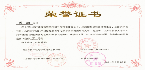 近日,第四届“东南大学?超星杯”高校大学生知识产权知识技能大赛基础技能团队竞赛在东南大学成功举办。真人赌博游戏_澳门赌博网-app*官网图书馆科技查新工作站严长虹、高丽老师指导,D营销213张娜啦同学获大赛一等奖,B电气223季翊同学获三等奖。真人赌博游戏_澳门赌博网-app*官网自2023年组队参赛以来,已经连续两年获大赛一等奖。