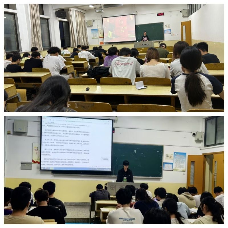 辅导员老师组织同学们学习民法典的物权、合同、人格权、婚姻家庭、继承、侵权责任等方面内容,针对大学生在网络购物、社交中可能遇到的信息泄露、网络诈骗等问题,剖析保护个人信息、签订合同、处理矛盾纠纷等方面案例。