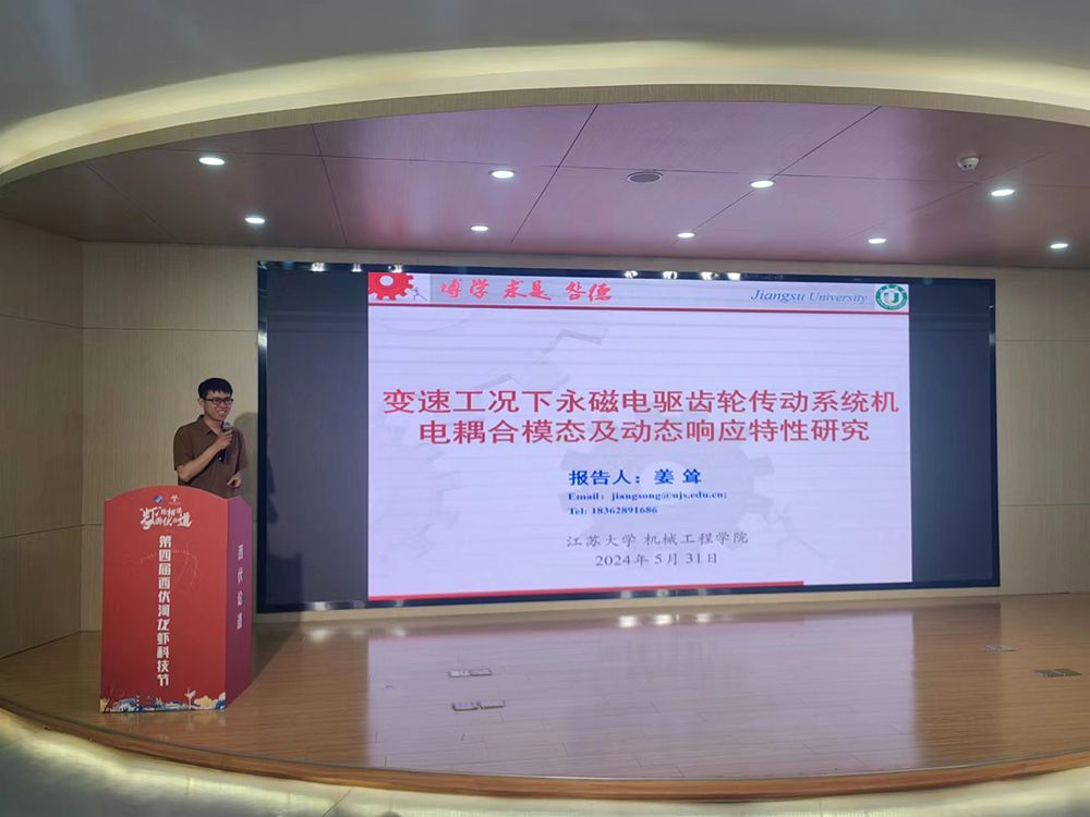 姜耸作题为“变速工况下永磁电驱齿轮传动系统机电耦合模态及动态响应特性研究”的学术报告。他从永磁同步电机与齿轮减速机构组成的传动系统动力学建模入手,详细分析了变速工况下电驱系统扭转共振的动态响应特性,以及电驱系统机电耦合的动力学特性和振动特性,并结合传动系统实验台对各种工况下实验台的动态响应特性进行了测试分析。