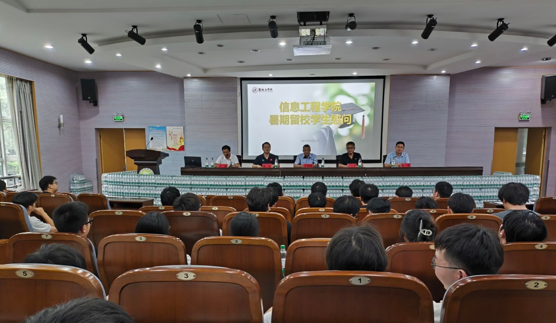 为深入了解暑期留校学生思想动态及学习生活情况,帮助学生改善学习方法,信息工程学院于8月14日下午在土木馆报告厅开展了2024年暑期留校学生慰问活动。学院党委书记杨军,院长王如刚,副院长徐森、周锋,专业系主任,毕业班辅导员及全体留校考研学生参加,党委副书记王源主持会议。