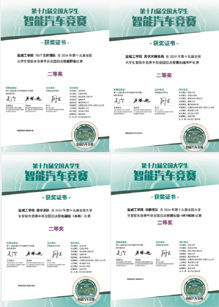 在华东赛区赛和全国总决赛中,真人赌博游戏_澳门赌博网-app*官网参赛师生与清华大学、同济大学、复旦大学、浙江大学、武汉大学、北京科技大学等高校展开激烈的角逐。电气工程学院刘丹丹老师、徐顺清老师联合指导,电气工程学院钱柯睿、陈庆南、优培学院王彬宇等同学组成的“冷静很”队获镜头组-INFINEON华东赛区一等奖、全国总决赛二等奖;电气工程学院刘丹丹老师、彭思敏老师联合指导,电气工程学院汤正晔、优培学院朱耿涛、曹哲浩等同学组成的“蛋仔派”队获电磁组华东赛区一等奖、全国总决赛二等奖;电气工程学院王林老师、吴云亚老师联合指导,电气工程学院赵杰、贾雪生、邵承乾等同学组成的“YCIT无所谓”队获越野组华东赛区一等奖、全国总决赛二等奖;电气工程学院陈中老师、信息工程学院孟海涛老师联合指导,电气工程学院杨烨同学组成的“西伏河睡务局”队获镜头组NXP华东赛区一等奖、全国总决赛二等奖;电气工程学院刘丹丹老师、信息工程学院李萍老师联合指导,电气工程学院仲琨、钱柯睿、优培学院花永康、黄浩原、王彬宇等同学组成的“明日五子”队获讯飞创意组华东赛区二等奖。