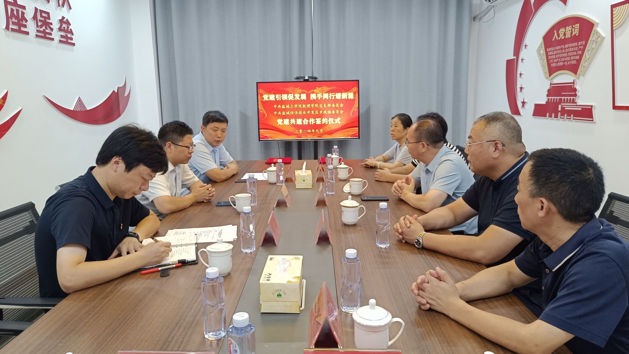 为进一步夯实党建工作基础,加强基层党组织建设,整合真人赌博游戏_澳门赌博网-app*官网、街道优势资源,促进真人赌博游戏_澳门赌博网-app*官网与街道互助共赢,9月13日上午,数理学院党总支与盐城经济技术开发区步凤镇党委签署党建结对共建协议。数理学院党总支书记魏伟华、步凤镇党委书记戴成及双方党员代表参加签约活动。