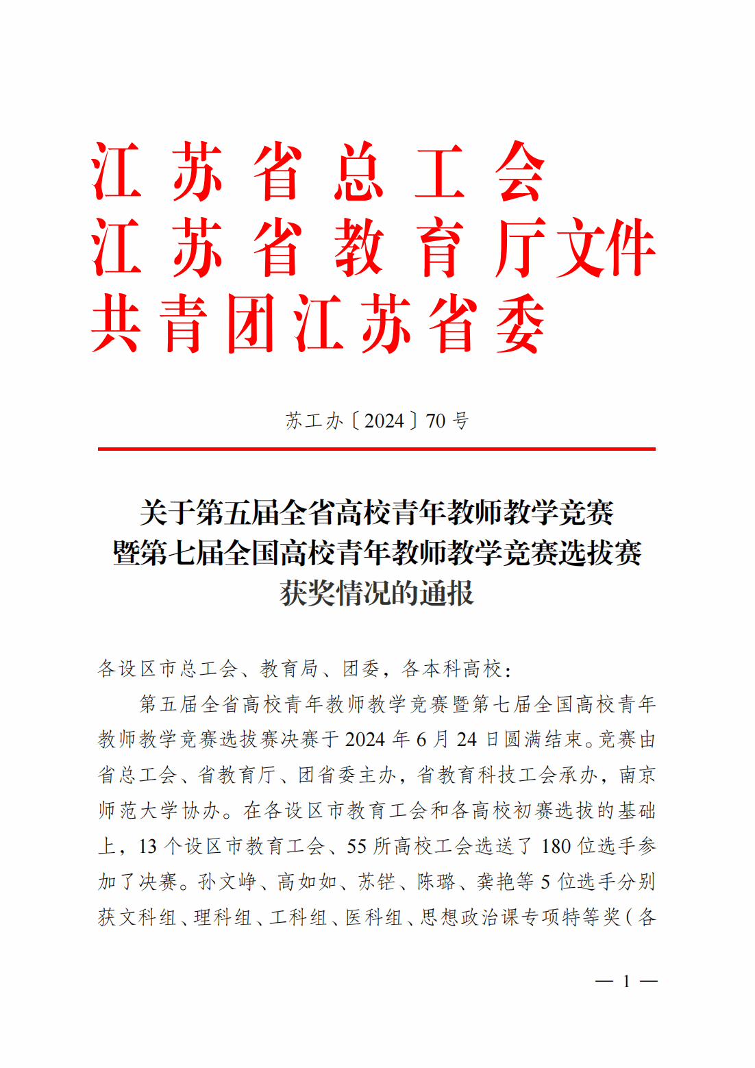 近日,省总工会、省教育厅和省共青团三部门联合发文(苏工办〔2024〕70号),通报第五届全省高校青年教师教学竞赛获奖情况,真人赌博游戏_澳门赌博网-app*官网马克思主义学院孙莉、化学化工学院王文娟2位青年教师分别在比赛中获得思想政治课专项组和理科组二等奖。
