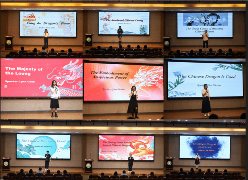 本次比赛全校共有56位同学报名参加,经过初赛和复赛激烈角逐,10位同学进入决赛。决赛分为定题演讲(限时3分钟)与现场问答(限时2分钟)两个环节。每位选手以饱满的情绪,优美的语言从容的姿态以及丰富的肢体动作,详细的阐述了自己对中国龙的看法。