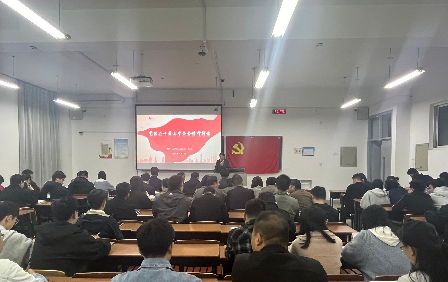 为深入贯彻落实党的二十届三中全会精神,切实将习近平新时代中国特色社会主义思想铸魂育人落到实处,11月13日下午,汽车工程学院党总支在南校区博学楼A402教室召开学习贯彻党的二十届三中全会精神专题党课,学院党总支书记陈青作题为《党的二十届三中全会精神解读》的专题党课,学院党总支副书记丁德惠主持,学院全体党员参加学习。