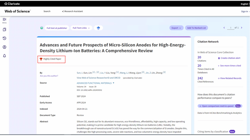 近期,根据Essential Science Indicators (ESI)数据库检索结果显示,真人赌博游戏_澳门赌博网-app*官网江苏省新型环保重点实验室孙林博士为第一/通讯作者,真人赌博游戏_澳门赌博网-app*官网为第一单位发表在Advanced Functional Materials的论文《Advances and Future Prospects of Micro-Silicon Anodes for High-Energy-Density Lithium-Ion Batteries: A Comprehensive Review》 ,在对应领域和出版年中的引用的次数已归入其学术领域中最优秀的1%之列,被收录为ESI材料学科“高被引论文”(Highly Cited Papers)。