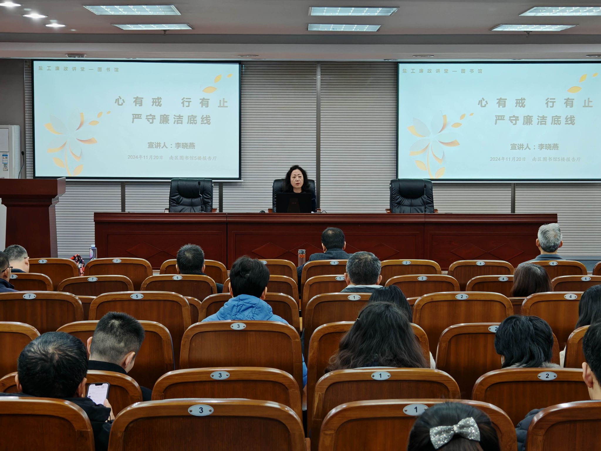 为深入学习贯彻党的二十届三中全会精神,进一步深化全面从严治党、强化党员干部纪律作风建设,11月20日下午,在南校区图书馆五楼报告厅,图书馆党总支开展主题为“心有戒 行有止 严守廉洁底线”廉政讲堂学习教育活动,党总支书记花爱军主持,全体教职工参加。