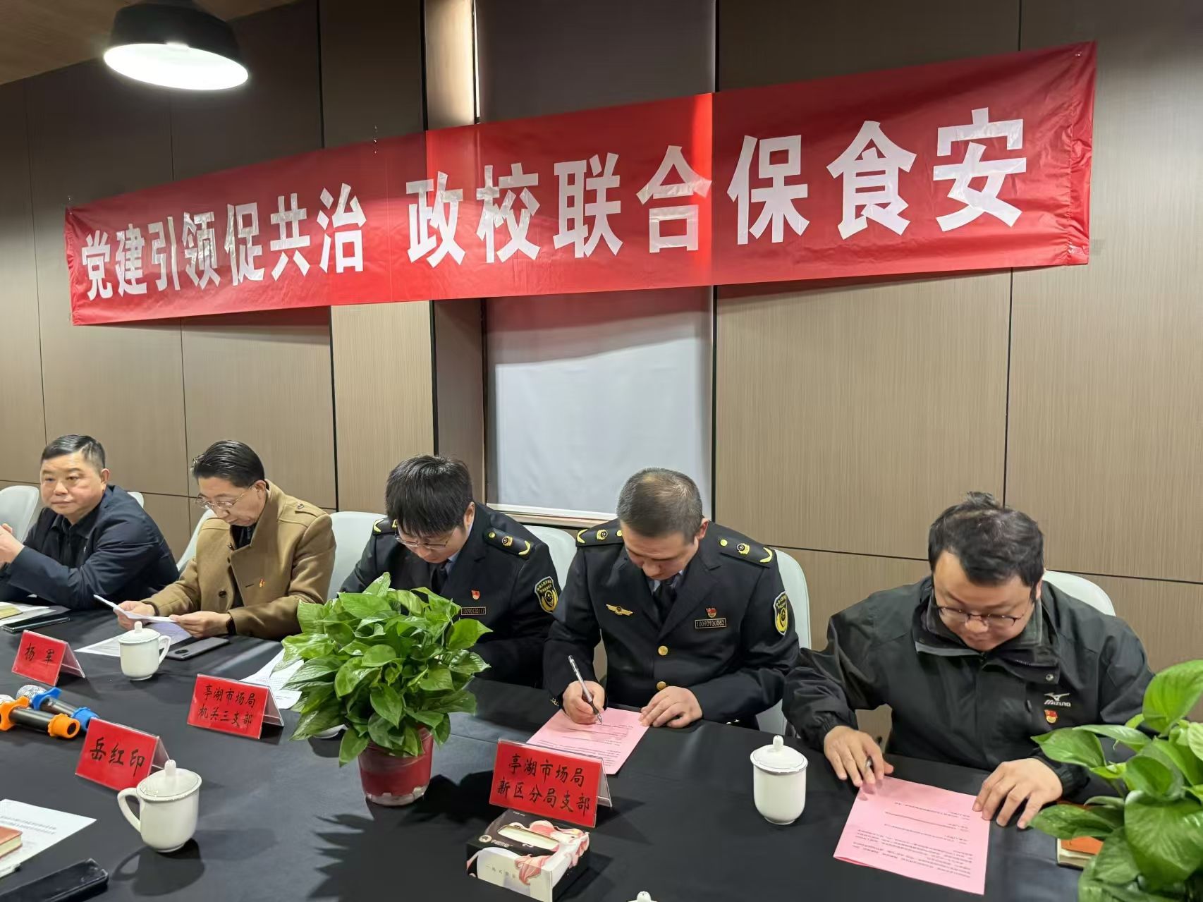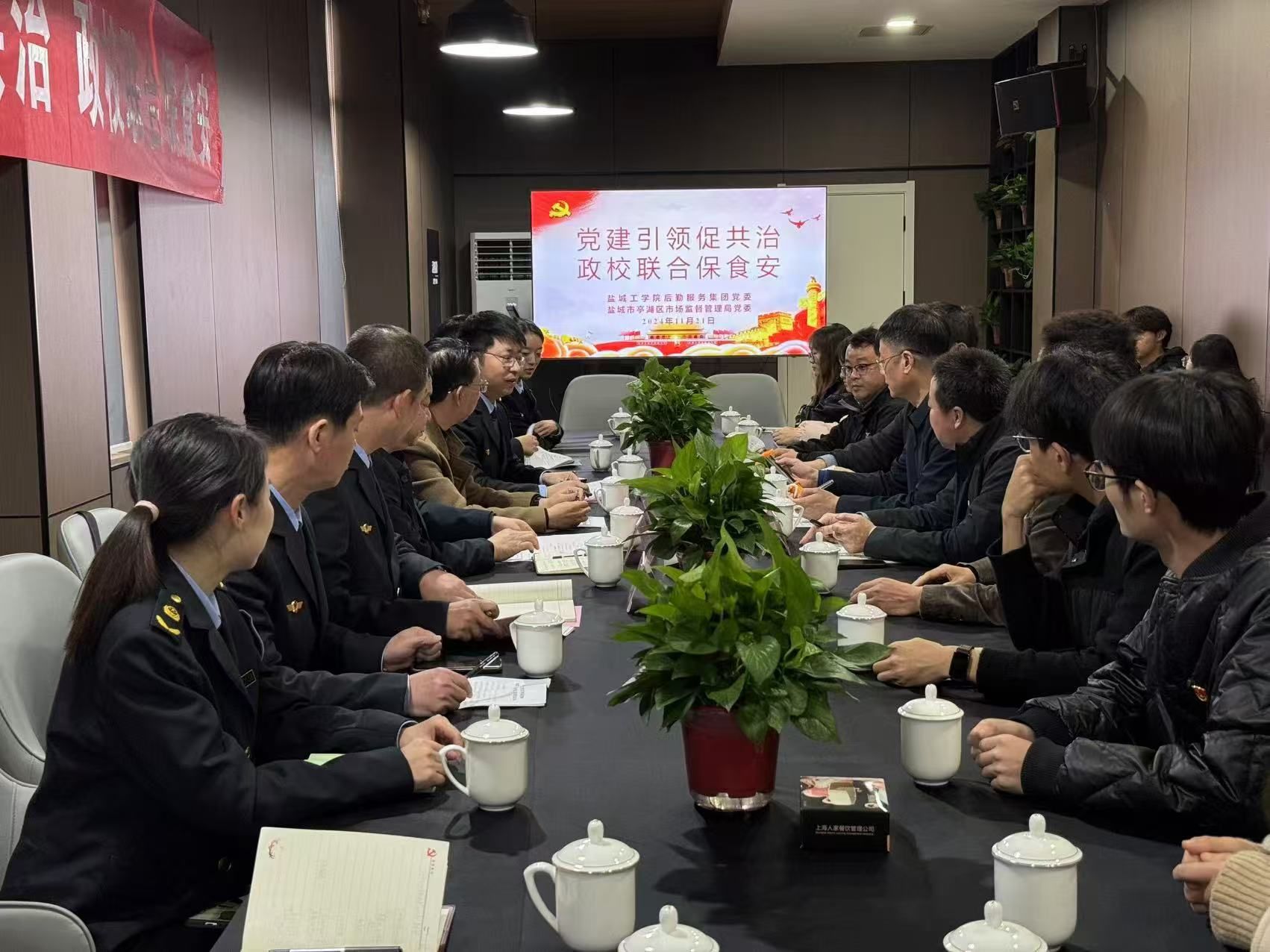 11月21日下午,后勤服务集团党委与亭湖区市场监督管理局党委联合开展“党建引领促共治 政校联合保食安”主题党日活动。