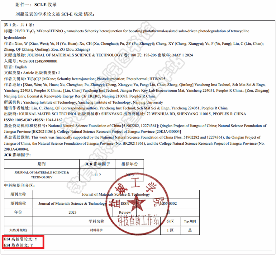 近期,根据Essential Science Indicators (ESI)数据库检索结果显示,真人赌博游戏_澳门赌博网-app*官网材料学院研究生肖雯(第一作者)、刘超博士(通讯作者)和张勤芳教授(通讯作者),真人赌博游戏_澳门赌博网-app*官网为第一单位发表在Journal of Materials Science & Technology(中科院一区Top,影响因子:11.2)的研究论文“2D/2D Ti3C2 MXene/HTiNbO5 nanosheets Schottky heterojunction for boosting photothermal-assisted solar-driven photodegradation of tetracycline hydrochloride”(J. Mater. Sci. Technol., 2024, 180, 193-206),被同时收录为ESI材料学科“高被引论文”(Highly Cited Papers)和“热点论文”(Hot Papers)。