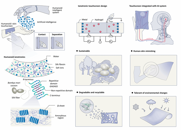 随着柔性和可穿戴电子技术的发展,市场对既具高性能、环保和可持续性的材料需求增加。当前,柔性电子面临的挑战之一是缺乏兼具机械性能与环境兼容性的材料。传统导电材料虽然电学性能优越,但柔性、环保性差,亟需替代方案。蚕丝蛋白(SF)因其生物可降解性和可持续性,成为理想替代材料,但常规方案将其与非可持续导电填料的结合影响了材料的可持续性。采用离子导体材料,通过生物高分子与盐类的协同作用,可以有效融合结构与功能,然而,SF离子导体在这一柔性电子领域应用尚未充分探索。本研究通过湿度诱导结晶优化SF离子导体中丝蛋白分子链结构,在保持优异离子导电性的同时,提升了机械性能和环境稳定性,提供了一种可回收、生物可降解的可持续柔性电子材料。此外,结合表面电容技术、物联网和人工智能技术,成功开发了绿色环保、智能化的触摸屏设备,具备触摸感应、远程控制、手写识别和智能人机交互等功能,展现了其在智能可穿戴电子领域的广阔前景。