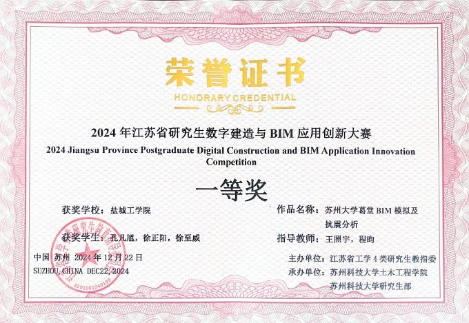 近日,由江苏省工学4类研究生教育指导委员会主办,苏州科技大学承办的“江苏省研究生数字建造与BIM应用创新大赛”在苏州顺利召开。经过激烈的决赛面试汇报、专家答辩等环节,由土木工程学院王照宇教授和程昀博士指导的“盐工一队”(孔凡馗、徐正阳、徐至威)凭借“苏州大学葛堂BIM模拟及抗震分析”荣获一等奖,刘宏伟教授和李隽副教授指导的“盐工二队”(钱伸莉、胡震东、孙弘扬)凭借“粟裕指挥部历史建筑全过程数字建造”获得优秀奖。