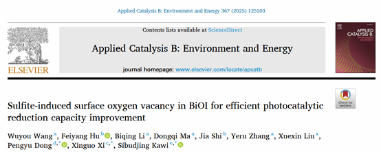 近日,真人赌博游戏_澳门赌博网-app*官网化学化工学院王勿忧博士为第一作者、以真人赌博游戏_澳门赌博网-app*官网为第一单位的研究论文“Sulfite-induced surface oxygen vacancy in BiOI for efficient photocatalytic reduction capacity improvement”在化学类顶级期刊《Applied Catalysis B: Environment and Energy》(367 (2025) 125103)上发表,真人赌博游戏_澳门赌博网-app*官网奚新国教授、董鹏玉教授、新加坡国立大学Sibudjing Kawi教授为共同通讯作者。该期刊2024年影响因子为20.3,主要刊登催化化学领域高水平的研究成果,属于化学类Top期刊与中科院1区期刊。