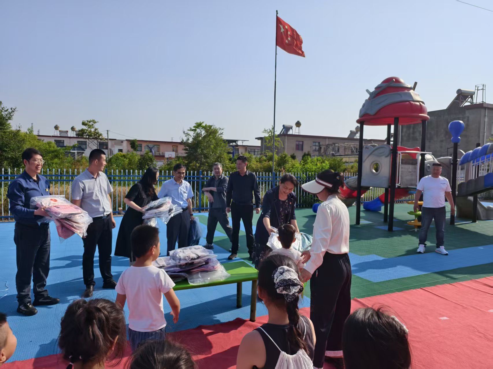 在沙荡社区党群活动中心,陈家港镇副镇长冯娟、挂职副镇长席东风分别介绍了乡镇工作开展情况,社区党总支书记张海军介绍了城市化新农村社区的发展情况;孙爱东、徐新华、谢毅敏等同志就帮促工作与社区领导进行了交流,就社区发展规划、教育、弱势群体帮扶等方面商定了具体共建框架,并签订了共建协议。随后,参会党员干部来到沙荡社区幼儿园,向56名儿童赠送书包,共同庆祝“六一”儿童节。