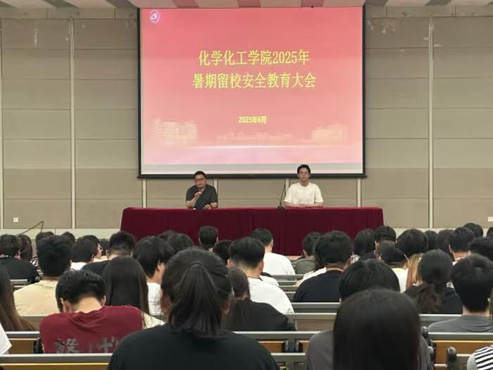 6月29日晚,为进一步加强暑期留校学生的管理工作,切实提高学生的安全意识,筑牢学生的安全防线,化学化工学院在化工楼报告厅召开2025年暑期留校学生安全教育大会。学院党委副书记邵景玲出席并讲话,全体大三辅导员和留校学生等200余人参加。会议由学工办副主任杨立远主持。