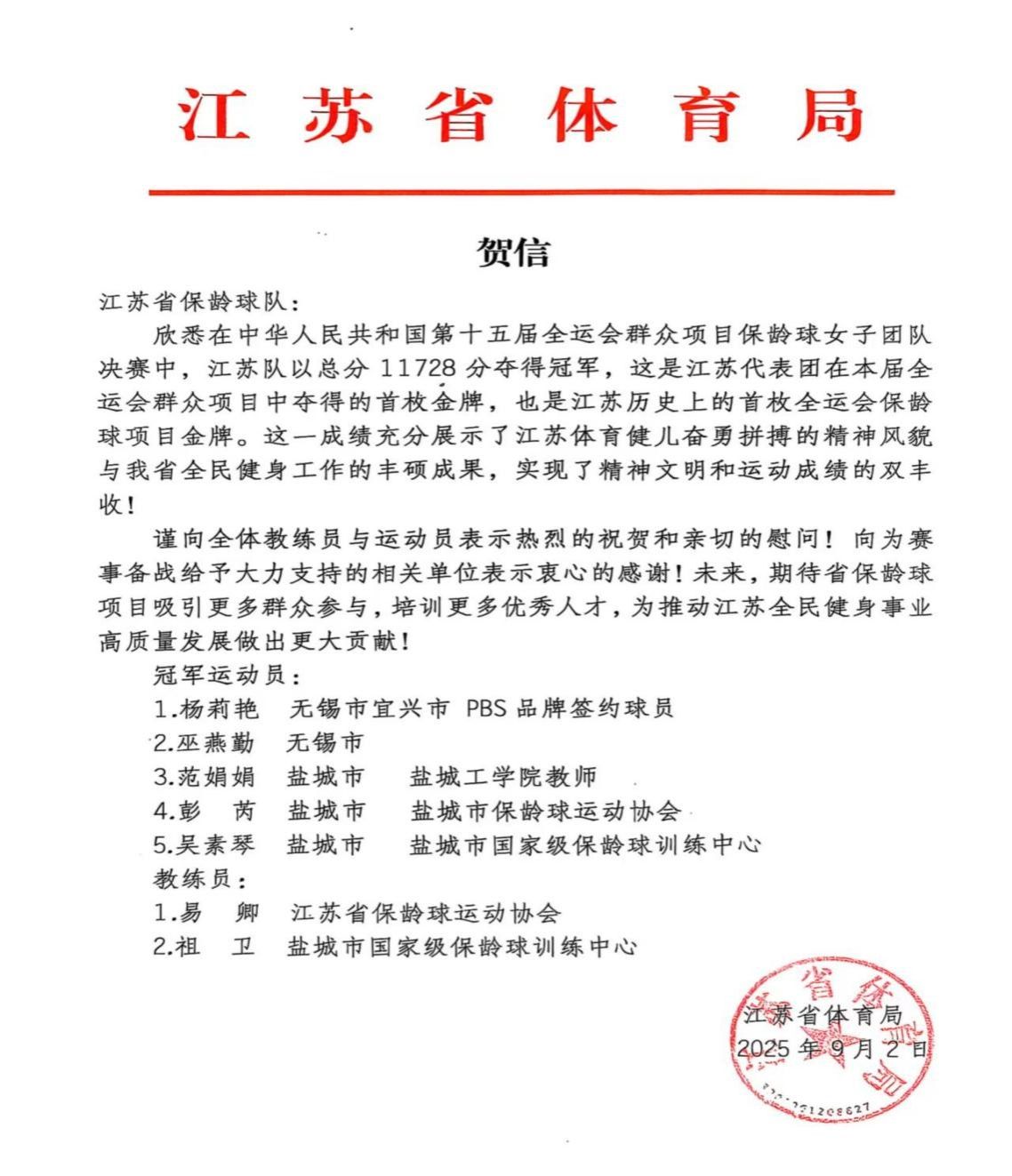 近日,江苏省体育局发出贺信对江苏省保龄球队表示祝贺。