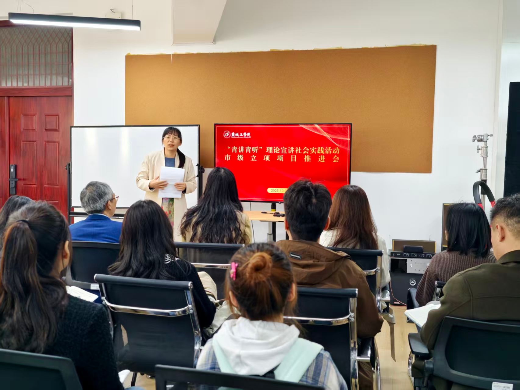 为帮助立项团队少走弯路、借鉴成熟经验,会议特别邀请2024年“青讲青听”市级立项优秀结项项目指导教师、马克思主义学院侯慧艳副教授作经验分享。侯慧艳从实践操作层面,将项目推进要点拆解为四大模块:在稿件内容上,要紧扣宣讲主题和盐城特色,兼顾理论深度与通俗表达,避免“空泛说教”;在宣讲技巧上,需注重语言风格与受众适配度,善用案例、互动等方式调动氛围;在组织筹备上,要细化时间节点、分工安排,做好前期调研与后期总结;在师生协作上,指导教师要全程精准指导、做好文稿把关,学生团队需强化责任意识与协作能力,形成“师生同频、上下联动”的良好工作格局。其分享内容详实具体、实用性强,为新立项团队提供了宝贵的“实践指南”。