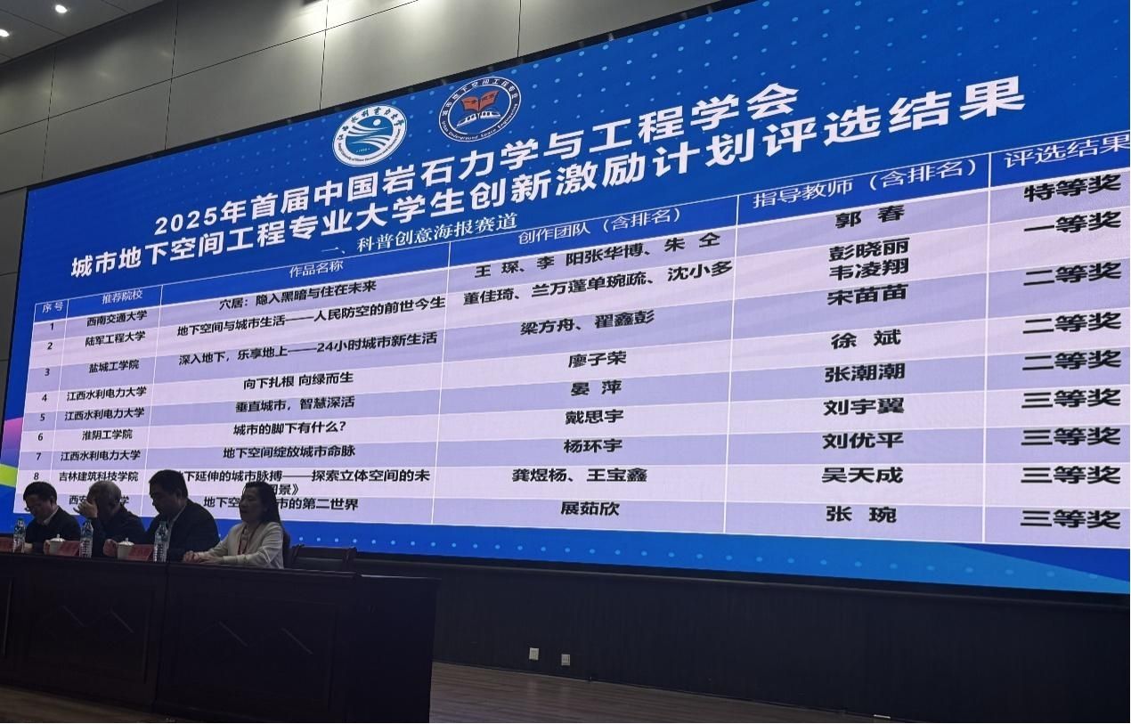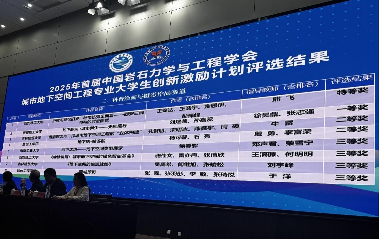 期间,开展了首届“中国岩石力学与工程学会城市地下空间工程专业大学生创新激励计划”评审与表彰工作。本届创作主题为“地下空间与城市生活”,主要目的是通过科普创意作品传播现代技术条件下城市地下空间开发对城市生活的创新性影响,推动城市地下空间的可持续利用与绿色智能创新,提升公众对城市地下空间的科学认知,促进城市地下空间领域的健康发展。真人赌博游戏_澳门赌博网-app*官网李富荣、殷勇、宋苗苗作为指导教师,梁方舟、翟鑫彭、杨可馨、石亮4名本科生组成的两支队伍,提交作品“地下轨-姑苏韵”“深入地下,乐享地上—24小时城市新生活”分别获得科普绘画和摄影作品赛道、科普创意海报赛道二等奖。