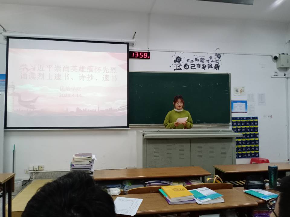 4月14日下午,在建军东路校区知行楼210教室,优培学院组织学生党员和青年团员代表开展“崇尚英雄,缅怀先烈”诵读红色家书活动。