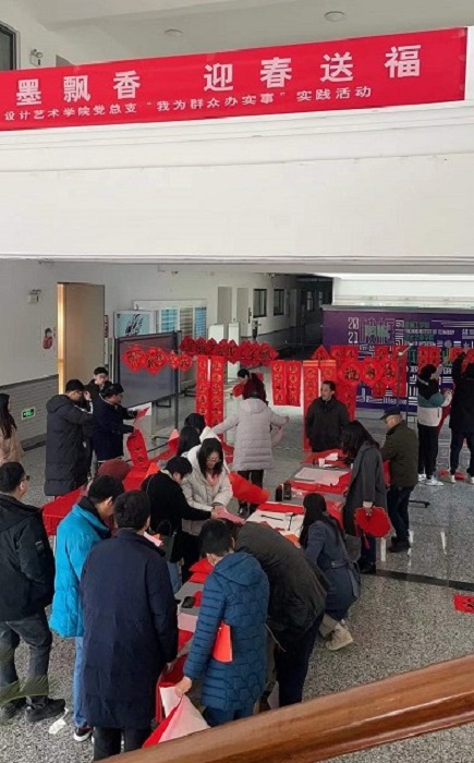 设计艺术学院党总支发挥专业教师特长,开展“我为群众办实事”志愿服务活动,在展示传统文化之美的同时传递冬日温暖,营造出文明祥和、高尚雅致的节日氛围,受到教职工的一致好评。