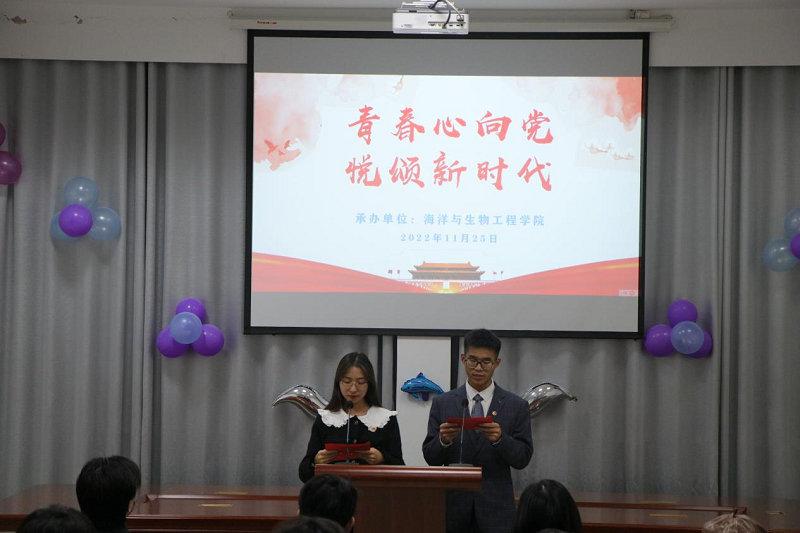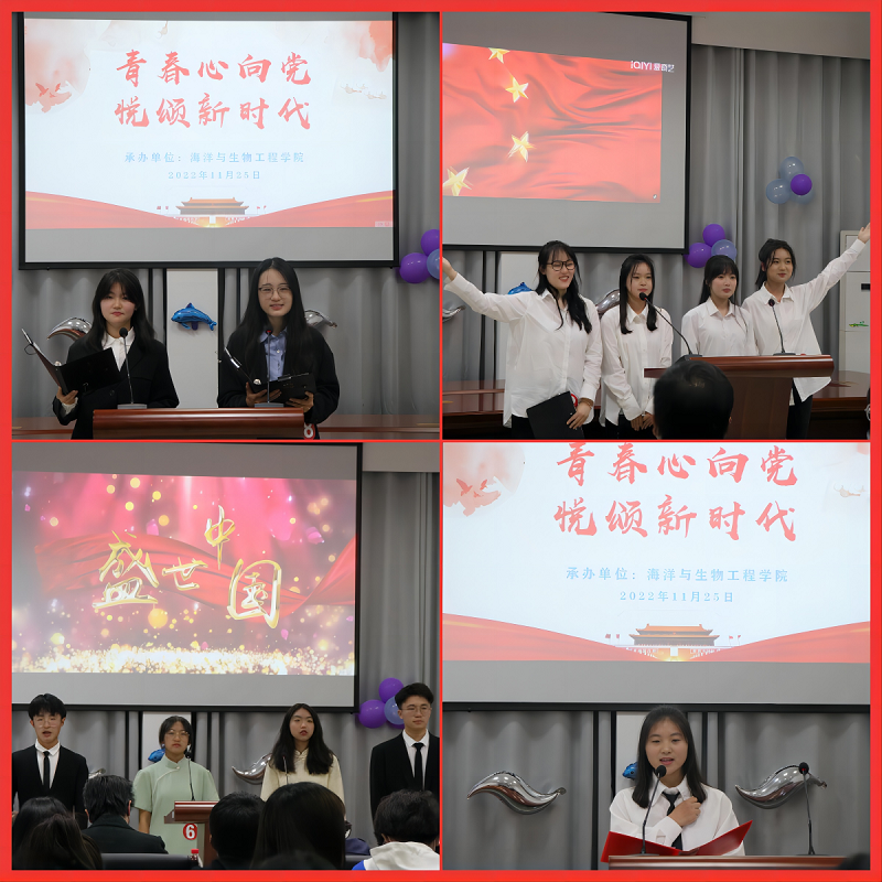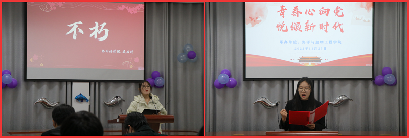 为了深入学习贯彻党的二十大精神,11月25日晚6:30,由校第二十七届校园文化艺术节组委会主办,海洋与生物工程学院承办的“青春心向党,悦领新时代”第五届朗诵比赛决赛在北校区海生学院会议室举行,党办副主任魏巍、校办副主任陈桂香、组织部组织科科长王源、宣传部宣传科科长江莹、校团委挂职副书记兼化工学院学工办主任李慧等担任评委。海生学院党总支书记高留才、副书记毕蕾,学生代表等60余人参加活动。