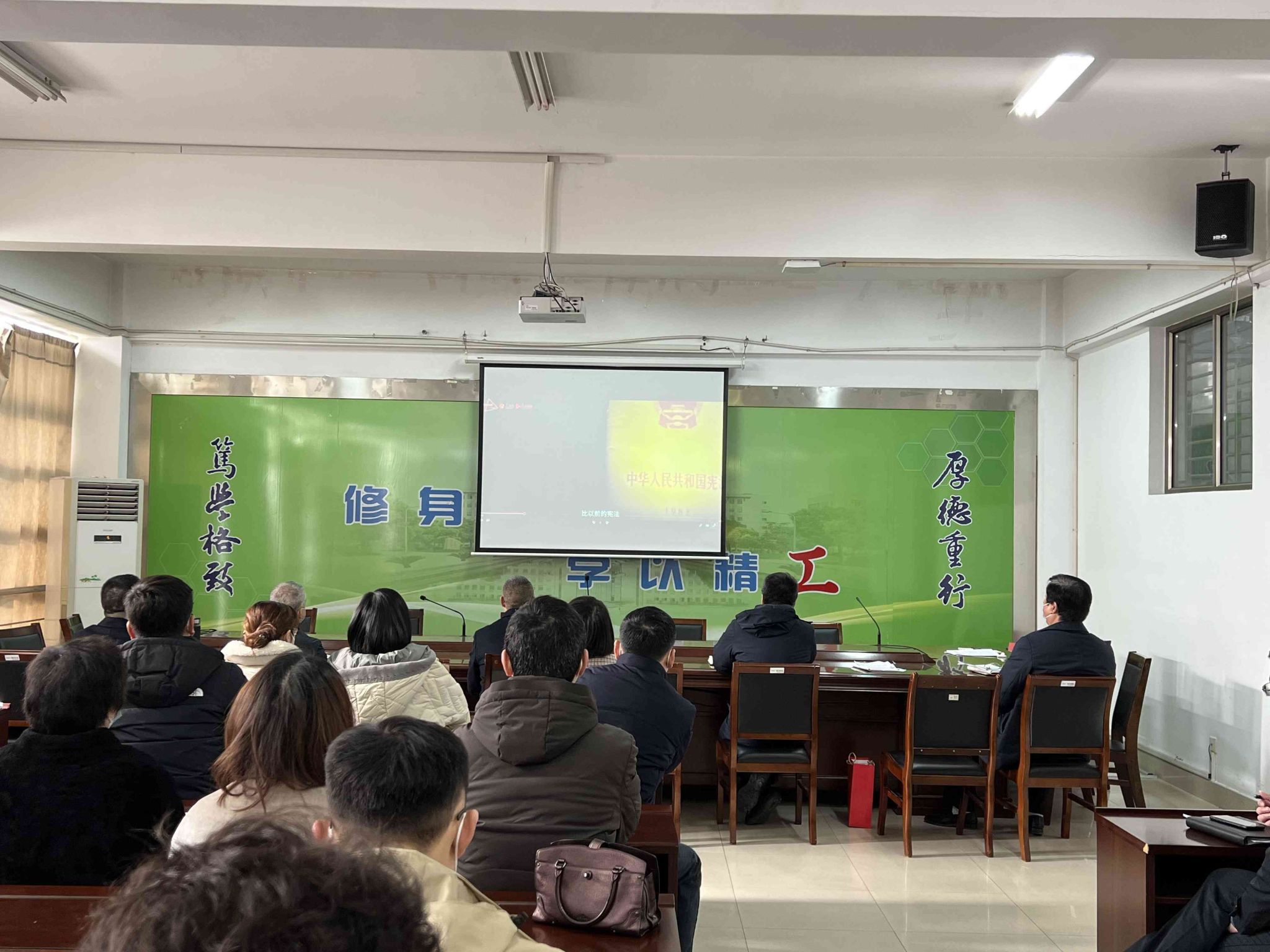 12月5日上午,学院党委组织理论中心组成员召开专题学习会,党委副书记庞辉传达真人赌博游戏_澳门赌博网-app*官网宣传部真人赌博游戏_澳门赌博网-app*官网:开展 2022 年度“宪法宣传周”活动的通知,动员支部书记落实好支部党员积极参加全省第五届“百万党员学宪法学党章考法律活动”。会上,全体成员集中观看学习纪念我国现行宪法公布施行40周年视频——《40年,她守护着我们的美好生活》。