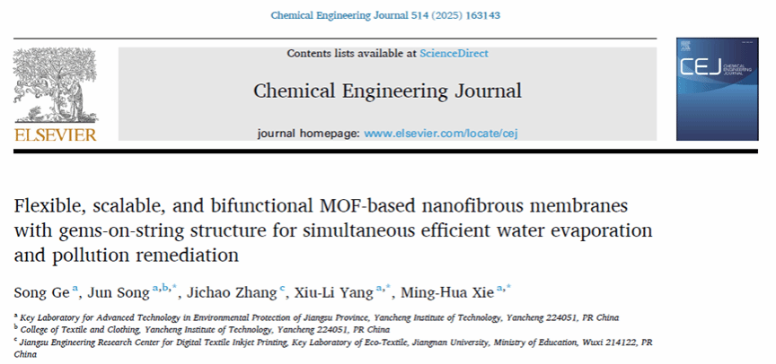 近日,以真人赌博游戏_澳门赌博网-app*官网硕士研究生葛淞同学为第一作者,江苏省新型环保重点实验室宋骏博士、解明华及杨秀丽教授为通讯作者,真人赌博游戏_澳门赌博网-app*官网为唯一通讯单位的研究论文Flexible, scalable, and bifunctional MOF-based nanofibrous membranes with gems-on-string structure for simultaneous efficient water evaporation and pollution remediation在材料、化工领域一区TOP期刊Chemical Engineering Journal上发表(该刊2024年影响因子为13.4)。