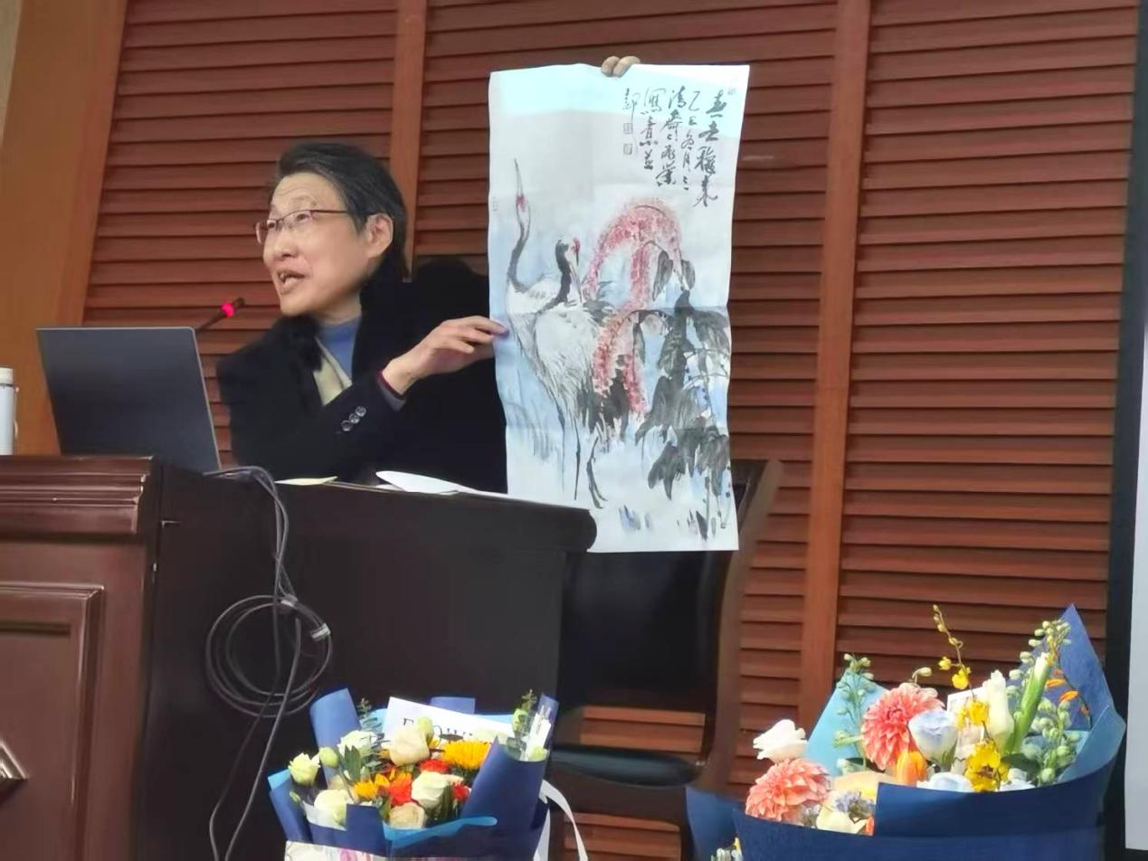季承业先生以盐城湿地的生态禀赋为切入点,结合自身数十年的创作实践,深入解读了丹顶鹤艺术的审美内涵与创作技巧。他从“万顷银光一点红”的自然之美,到“一日为偶,终身相守”的精神象征,系统阐述了丹顶鹤如何从自然生灵升华为艺术图腾,以及湿地文化赋予艺术创作的乡土情愫与精神内核。讲座中,季承业还分享了自己在上海、南通、盐城等地举办巡回画展的创作心得,展示了其系列丹顶鹤水墨作品的艺术特色,让在场师生深刻领略到传统水墨画的笔墨韵味与湿地文化的独特魅力。