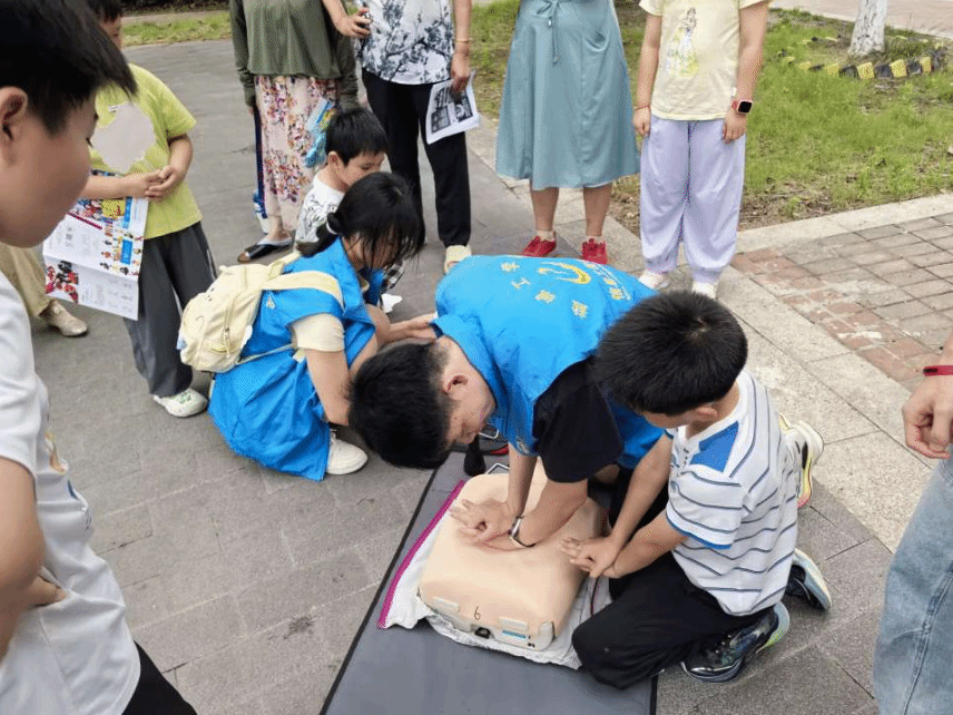 志愿者在盐城市碧桂园天玺小区“龙虾节”现场,设置模拟急救区,用情景短剧再现“有人突然倒地”的应急场景,吸引居民围观参与。