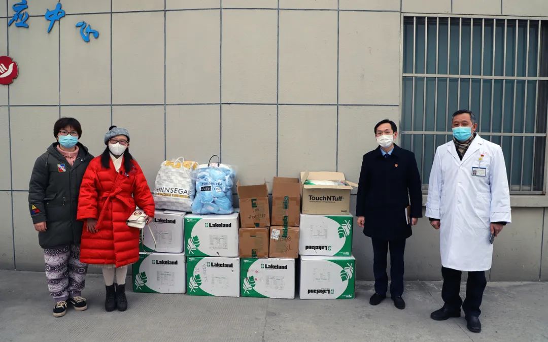 新冠肺炎疫情期间,于小娟(左二)筹款购买防护服和护目镜捐赠给江苏援鄂医疗队。