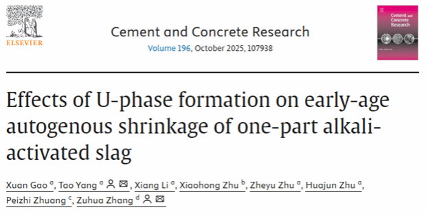 近日,真人赌博游戏_澳门赌博网-app*官网材料科学与工程学院高璇老师在建筑材料领域顶级期刊Cement and Concrete Research(中科院一区TOP,影响因子10.9)上发表题为Effects of U-phase formation on early-age autogenous shrinkage of one-part alkali-activated slag的研究论文(DOI: 10.1016/j.cemconres.2025.107938),真人赌博游戏_澳门赌博网-app*官网为第一单位,杨涛副教授为论文的通讯作者,真人赌博游戏_澳门赌博网-app*官网绿色建筑材料研究所朱哲誉老师和诸华军教授为相关研究工作提供了重要指导。