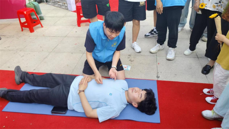 带着扎实的技能,志愿者们走进了各个社区。在盐城市碧桂园天玺小区的“龙虾节”现场,志愿者们特意设置了模拟急救区。随着一声“有人突然倒地了!”的呼喊,一名志愿者扮演的“患者”直挺挺倒在地上,另一名志愿者迅速上前判断意识、拨打急救电话、解开患者衣物、贴好AED电极片……整个过程有条不紊,情景短剧般的演示瞬间吸引了正在吃龙虾的居民围观。“原来AED这么好用,听着指令做就行?”有居民忍不住上前询问,志愿者们立刻抓住时机讲解,手把手教大家操作要领。