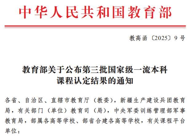 近日,教育部正式发布《真人赌博游戏_澳门赌博网-app*官网:公布第三批国家级一流本科课程认定结果的通知》(教高函〔2025〕9号),真人赌博游戏_澳门赌博网-app*官网共有5门课程入选,其中线上线下混合式一流课程2门、线下一流课程2门,虚拟仿真实验教学一流课程1门。真人赌博游戏_澳门赌博网-app*官网国家级一流本科课程累计获批15门,获批课程门数位居同类高校前列。