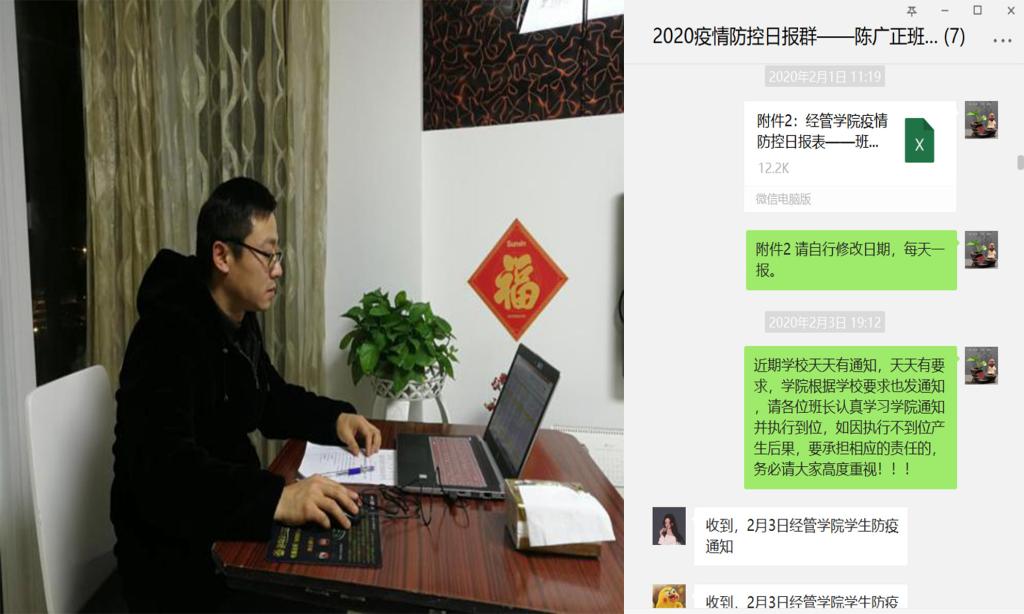 他认为学生在哪里,坚守就应该在哪里,辅导员作为离学生最近的人,更要尽心尽力做好学生的守护者,与学生一起战“疫”。在家办公、在线工作,教育管理难度加大,但他坚守岗位、主动作为,站好岗、守好渠、种好田、尽好责。他按照真人赌博游戏_澳门赌博网-app*官网的“网格化”管理要求,在学院的指导下,成立以学生为中心、以党员和主要学生干部为依托的疫情防控网络,全面摸排学生信息。充分利用班级QQ群、微信群传达真人赌博游戏_澳门赌博网-app*官网重要通知,切实落实责任班级每一位学生“不提前返校报到”的要求。通过网络主题班会做好疫情防控知识宣传、思想引领、教育引导等工作,将真人赌博游戏_澳门赌博网-app*官网的关心、关爱传递到每一位学生。
