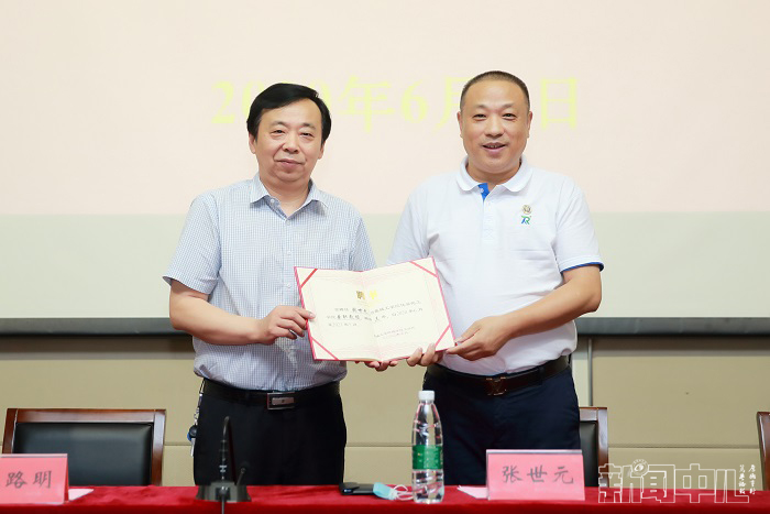 王路明副校长与张世元董事长共同为“润泰化学真人赌博游戏_澳门赌博网-app*官网成膜助剂研究所”揭牌,并向张世元董事长颁发了兼职教授聘书。