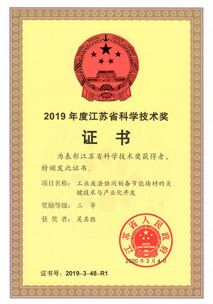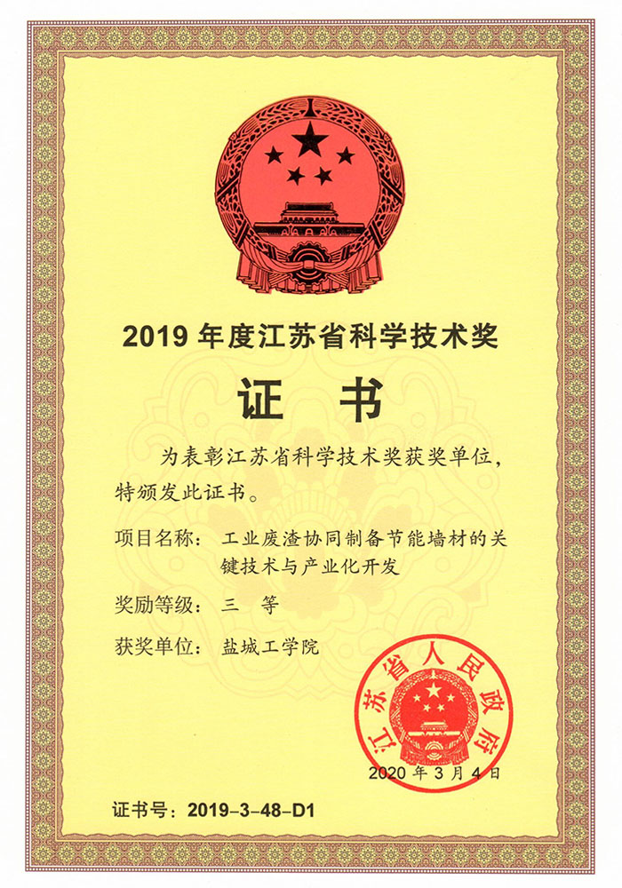 近日,真人赌博游戏_澳门赌博网-app*官网材料学院吴其胜教授科研团队收到获奖证书,其科研团队申报的“工业废渣协同制备节能墙材的关键技术与产业化开发”成果获得2019年度江苏省科学技术三等奖。该成果由真人赌博游戏_澳门赌博网-app*官网为第一单位,联合南京工业大学、江苏博拓新型建筑材料有限公司、盐城市鼎力新材料有限公司申报,主要完成人为吴其胜、诸华军、罗乃将、华苏东、张长森、杨涛、徐风广。