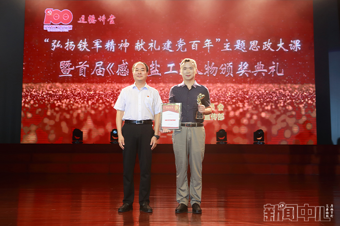 党委副书记、校长方海林向萧建波颁发“感动盐工”人物证书和奖杯