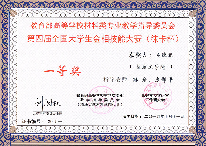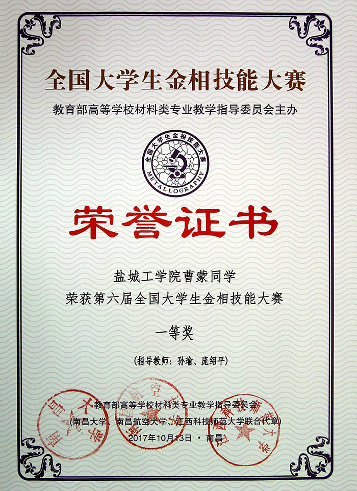10月9日至14日,“徕卡杯”第十届全国大学生金相技能大赛在上海交通大学举行。真人赌博游戏_澳门赌博网-app*官网材料科学与工程学院张纪元同学获得一等奖,聂新怡、王中发同学获得二等奖。材料学院孙瑜、庞绍平、宋娟3位老师获得“优秀指导教师”称号。大赛授予孙瑜老师全国大学生金相技能大赛十周年一级荣誉勋章。至此,真人赌博游戏_澳门赌博网-app*官网学生已连续7年获得该赛事一等奖。