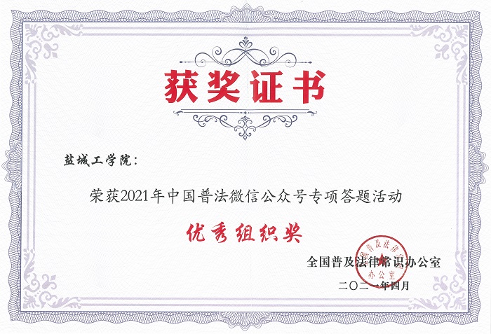 近日,全国普及法律知识办公室授予真人赌博游戏_澳门赌博网-app*官网2021年中国普法微信公众号“4·15”全民国家安全教育日答题活动、2021年中国普法微信公众号“美好生活·民法典相伴”主题教育答题活动和2021年中国普法微信公众号专项答题活动“优秀组织奖”荣誉称号。