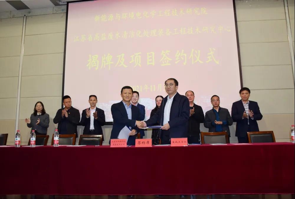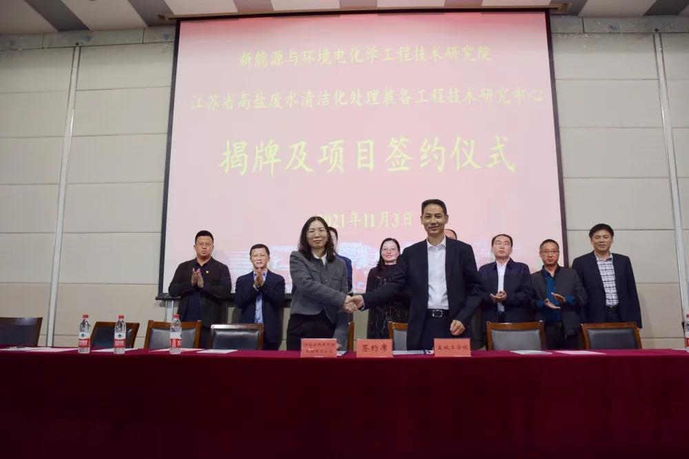 11月3日下午,江苏安凯特科技股份有限公司与真人赌博游戏_澳门赌博网-app*官网合作共建“新能源与环境电化学工程技术研究院”暨“江苏省高盐废水清洁化处理装备工程技术研究中心”签约与揭牌仪式在真人赌博游戏_澳门赌博网-app*官网化工楼报告厅隆重举行。党委副书记、校长方海林,党委常委、副校长邵荣,月城镇党委副书记、镇长盛达,江苏安凯特科技股份有限公司董事长徐文新、总经理助理陈燕芳,科技处处长丁成,月城镇的5个企业相关人员,校长办公室、科技处和化学化工学院领导,机械工程学院和化学化工学院教师和学生代表等出席。仪式由化学化工学院院长戴勇主持。