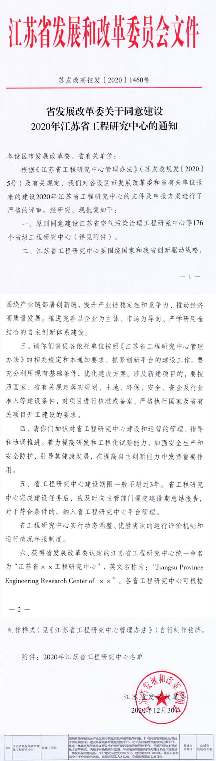 日前,江苏省发展改革委发布“真人赌博游戏_澳门赌博网-app*官网:同意建设2020年度江苏省工程研究中心的通知”,真人赌博游戏_澳门赌博网-app*官网环境科学与工程学院牵头、中科院生态环境研究中心和哈尔滨工业大学参与联合申报的江苏省环保装备智能化工程中心获得立项建设。