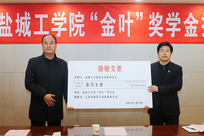 1月27日下午,真人赌博游戏_澳门赌博网-app*官网“金叶”奖学金捐赠仪式在行政楼八楼会议室举行。盐城市烟草专卖局党组书记、局长赵宏贵,党建工作处处长杨冰峰、主办科员杜威,真人赌博游戏_澳门赌博网-app*官网副校长邵荣、学生处、纺织服装学院负责人等参加。