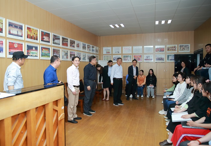 指导组还观看设计艺术学院学院2021届毕业生设计作品展览和教工党员结合党史学习教育开展课程思政实践的成果展示,观摩了“梦之声”合唱团训练,聆听师生在校园红色阵地铁军广场讲述新四军的故事。