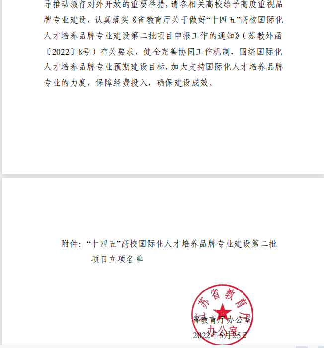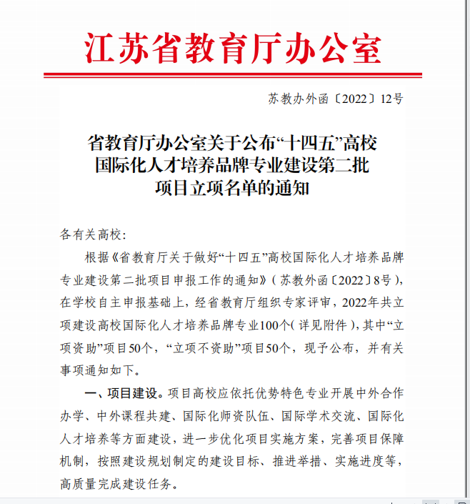 “高校国际化人才培养品牌专业”是省教育厅在“十四五”期间实施教育对外开放质量提升工程项目之一。“十四五”期间,教育厅共立项建设高校“国际化人才培养品牌专业”150个,其中“立项资助”项目100个,“立项不资助”项目50个。2021年已批设立项资助建设专业50个。