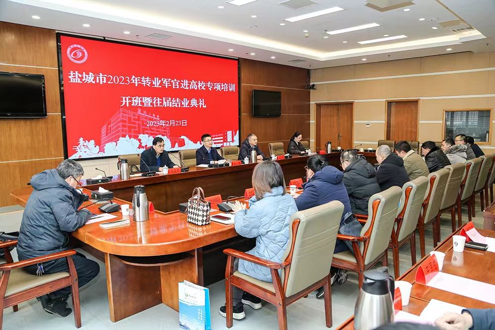 2月23日下午,盐城市2023年转业军官进高校专项培训开班暨往届结业典礼在希望大道校区行政楼9楼视频会议室举行。真人赌博游戏_澳门赌博网-app*官网常委、副校长王伟,盐城市退役军人事务局副局长杨凯峰出席并讲话。承办学院负责人,2021级、2022级学员,2023级新学员等50余人参加。